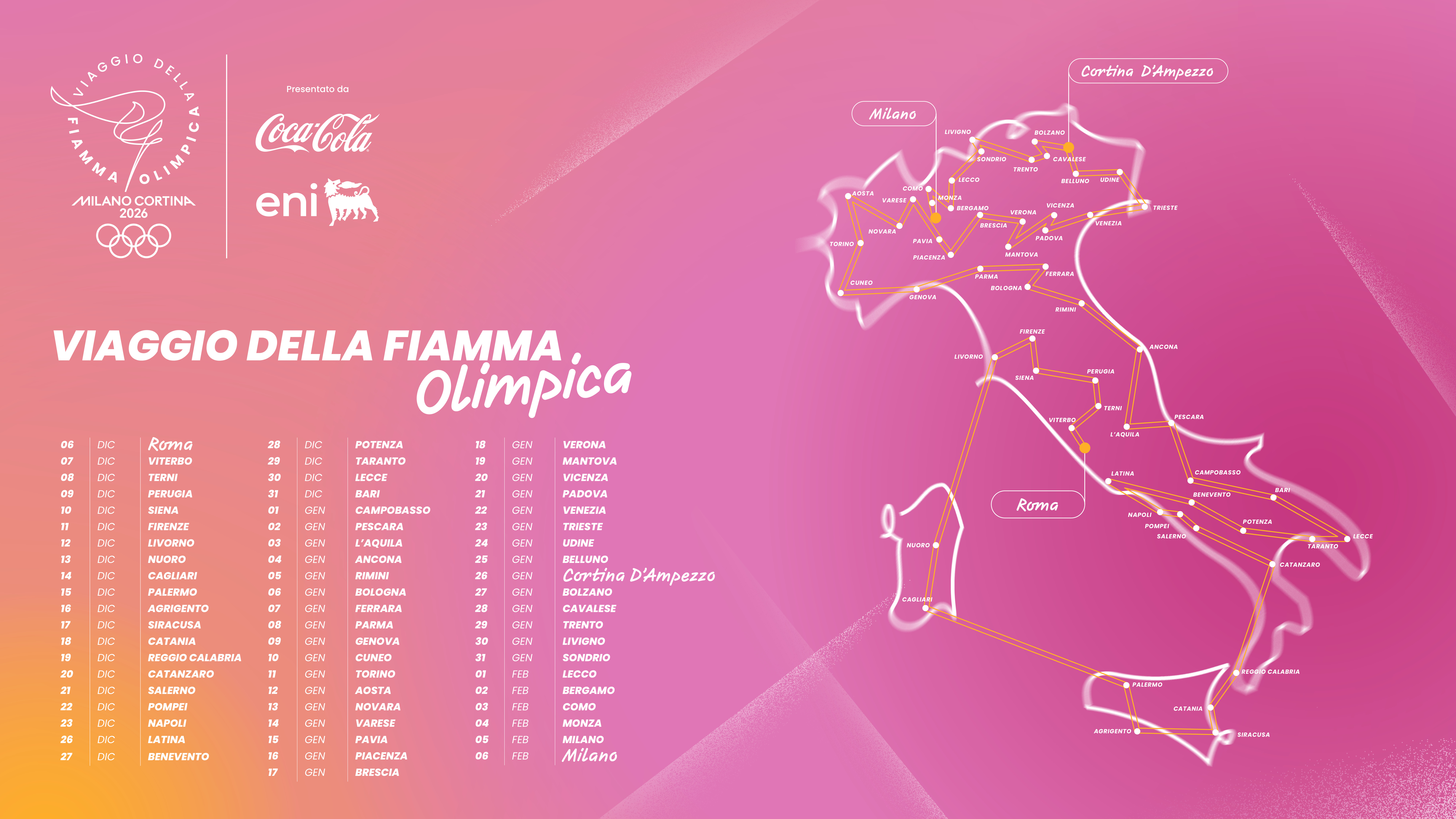 Il Viaggio della Fiamma Olimpica avrà inizio il 26 novembre 2025 con l’accensione del sacro fuoco a Olimpia, in Grecia. Dopo un lungo percorso di 63 giorni che toccherà tutte le 110 province italiane, la Fiamma raggiungerà Cortina d’Ampezzo il 26 gennaio 2026, una data carica di significato: proprio in quel giorno, 70 anni fa, Cortina ospitava la Cerimonia d’Apertura dei primi Giochi Olimpici Invernali organizzati in Italia. La Fiamma sarà accolta in una cerimonia ufficiale in piazza Angelo Dibona.